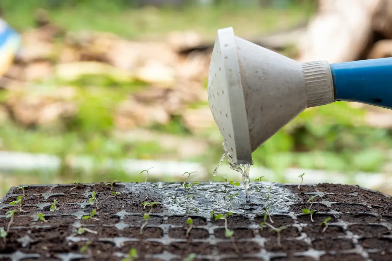 Nässe ist nicht dasselbe wie Feuchtigkeit. Nach der Aussaat halten Sie den Boden feucht. Das geht am besten mit einer Blumenspritze. Mit einer Gießkanne kommt meistens ein Wasserstrahl an eine Stelle, wodurch der Boden zu nass wird und die Samen verfaulen. An der Erde sieht man schnell, ob sie zu feucht ist, denn dann bildet sich Schimmel. Es ist besser, öfter eine kleine Menge zu geben, als auf einmal eine große Menge, und verwenden Sie vorzugsweise die Sprühfunktion einer Pflanzenspritze.